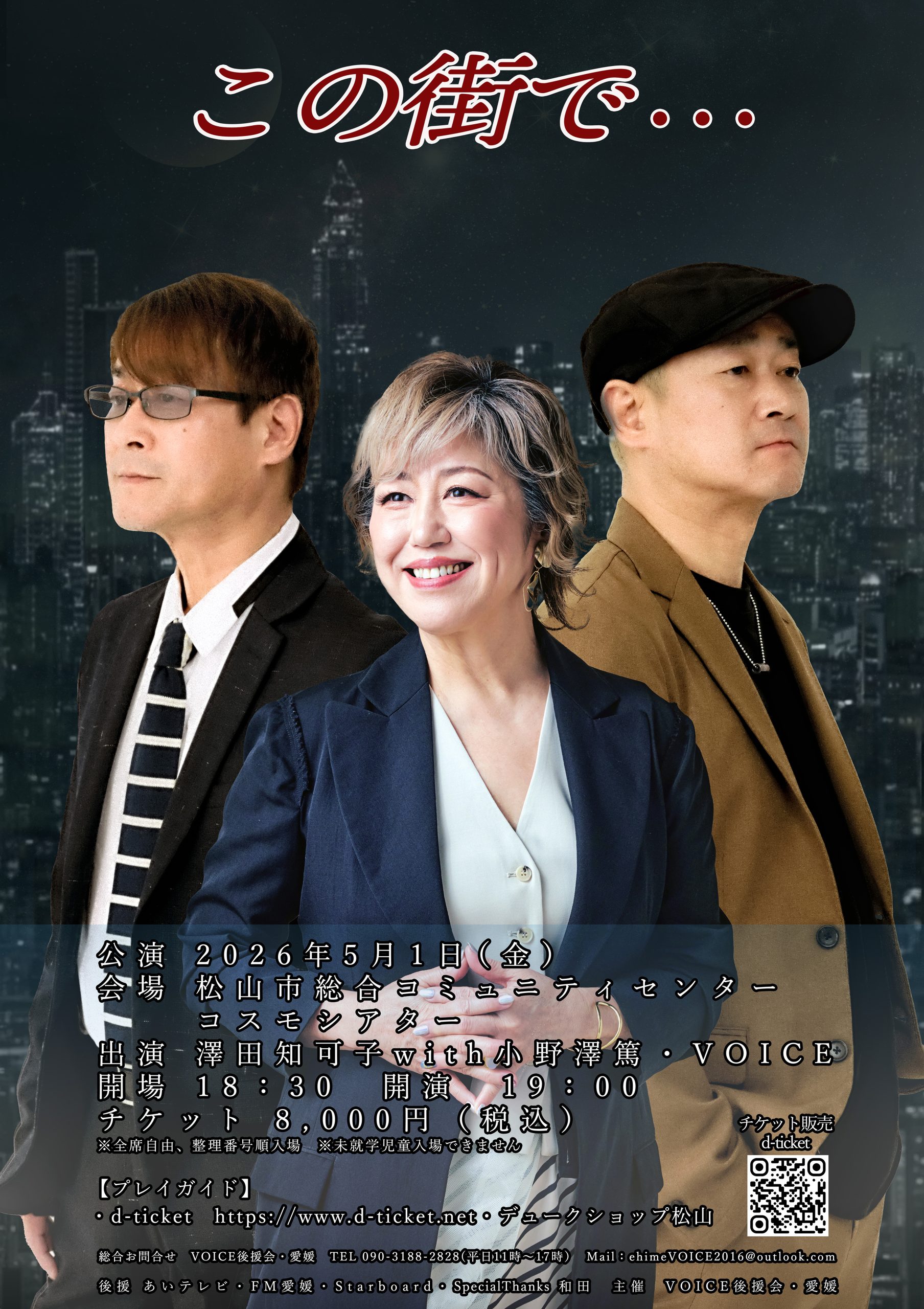 | 詳細 | 2026年 この街で・・・ 出演 澤田知可子with小野澤篤・VOICE 名曲と共に贈るスペシャルコンサートが愛媛で開催されます。 <特記事項> ※車椅子席希望の方は通常席を購入の上VOICE後援会・愛媛までご連絡ください。 ※会場内での録音・撮影は一切禁止とさせていただきます。 <プレイガイド> 2026年2月21日(土)11:00 発売開始 ・d-ticket https://www.d-ticket.net ・デュークショップ松山 後援 あいテレビ・FM愛媛・Starboard・SpecialThanks 和田 主催 VOICE後援会・愛媛 |