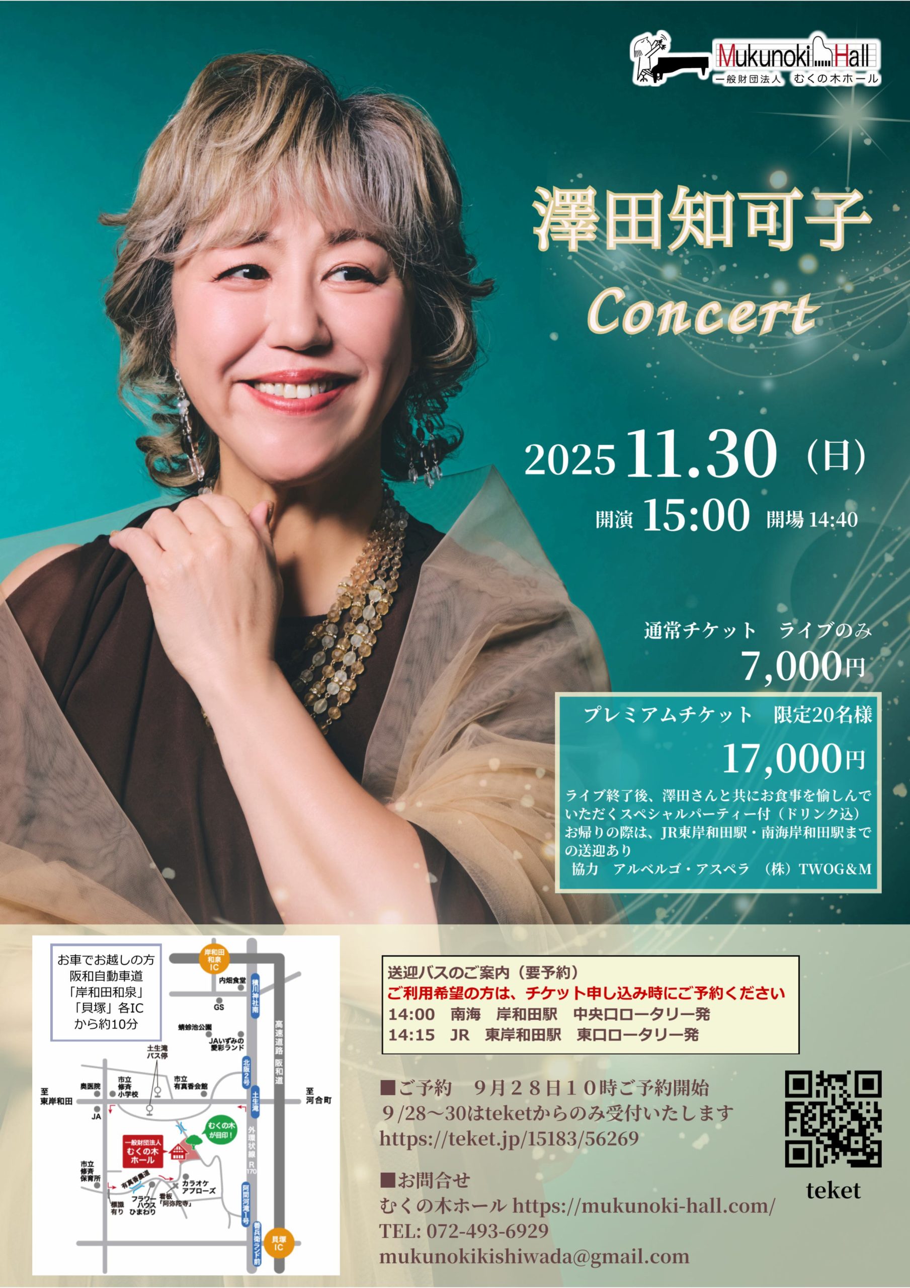 詳細 | 毎年恒例のスペシャルライブです。素敵な空間で是非、澤田知可子をご堪能下さいませ。 ご予約は9月28日10時スタート(28〜30日はteketからのみ受付となります) https://teket.jp/15183/56269 それ以降はTel:072-493-6929(10:00~17:00)からもご予約頂けます。 ※送迎バスがあります。 チケット購入時にお申し込み下さい。 14:00 南海 岸和田駅 中央口ロータリー 発 14:15 JR東岸和田駅 東口ロータリー発 ※お車でいらっしゃる方は阪和自動車道『岸和田和泉』、『貝塚』それぞれから約10分です。 |