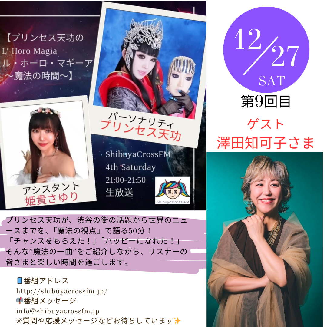 | 詳細 | プリンセス天功が、渋谷の街の話題から世界のニュースまでを、「魔法の視点」で語る50分! 「チャンスをもらえた!」「ハッピーになれた!」 そんな”魔法の一曲”をご紹介しながら、リスナーの皆さまと楽しい時間を過ごします。 |