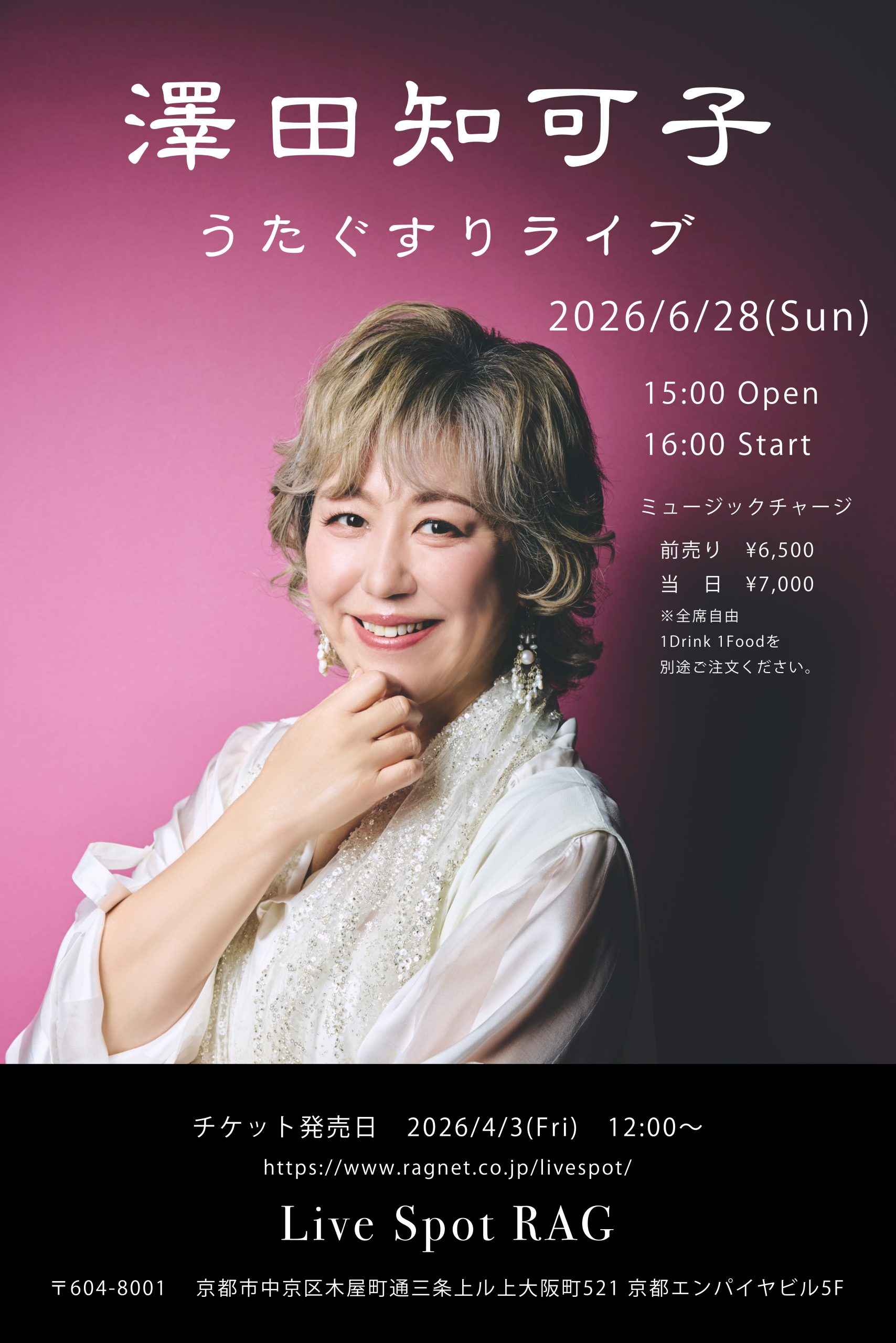 | 詳細 | 『2026/4/3 12時より RAG WEB SITE<https://www.ragnet.co.jp/livespot/>にて発売開始』 久しぶりに京都でゆっくりライブさせて頂きます。 是非お越し下さい!! 出演 Vocal:澤田知可子 / Piano:小野澤 篤 |